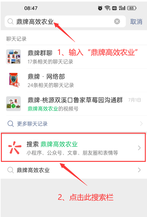 2、在輸入框輸入“鼎牌高效農(nóng)業(yè)”,下方會出現(xiàn)“搜索欄”,點擊搜索。