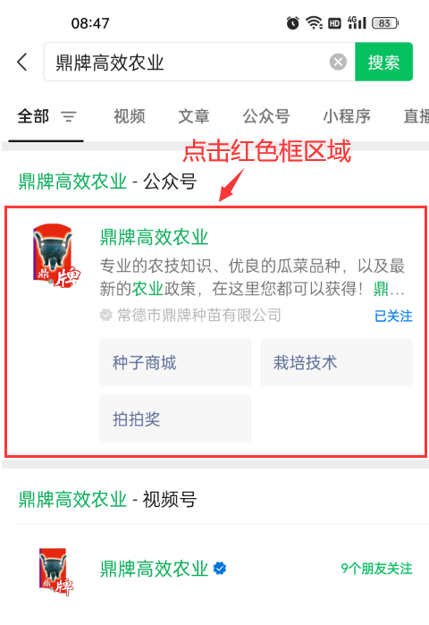 3、點擊紅色框區(qū)域的“鼎牌高效農(nóng)業(yè)”公眾號信息,進入詳細頁面。
